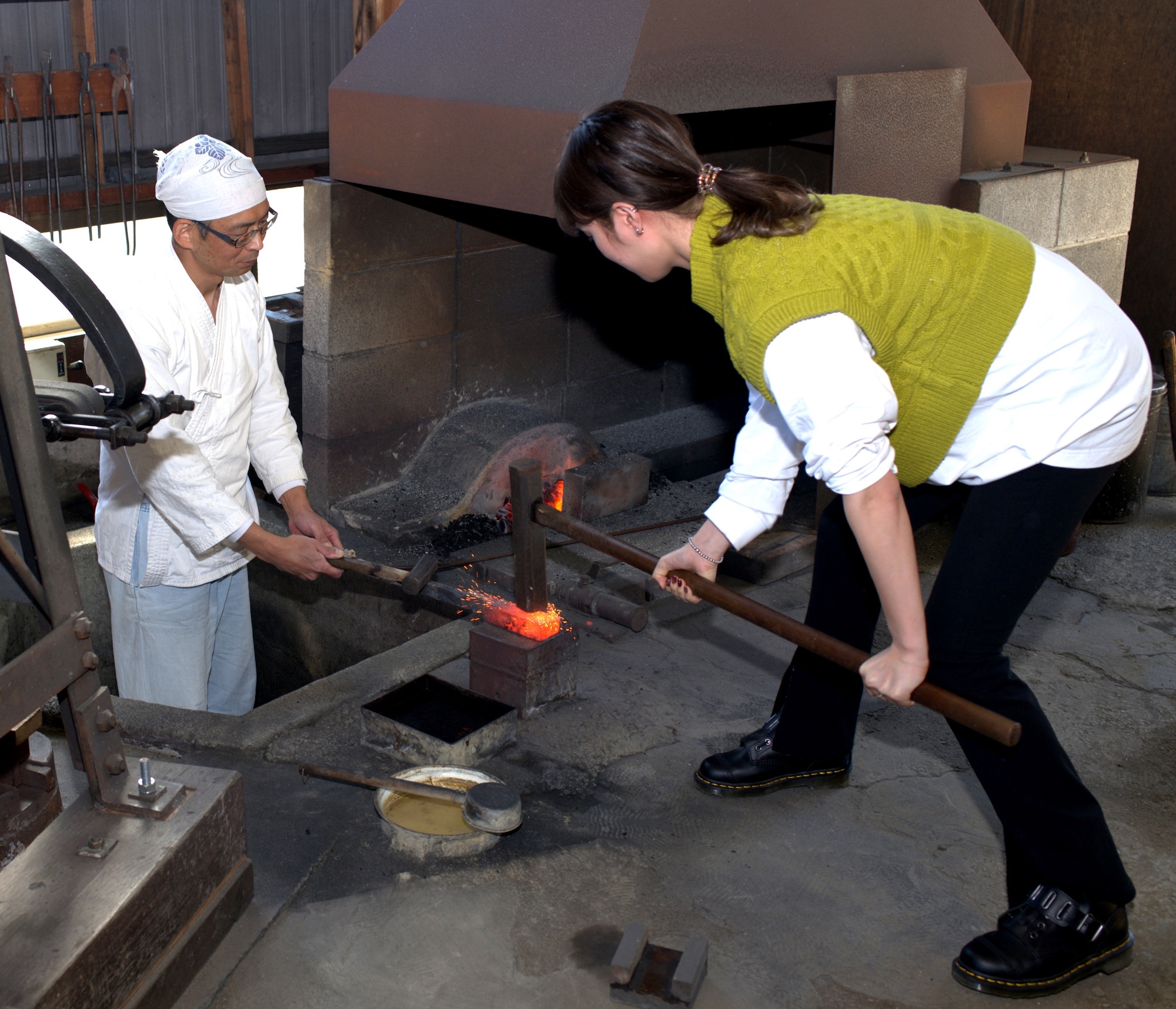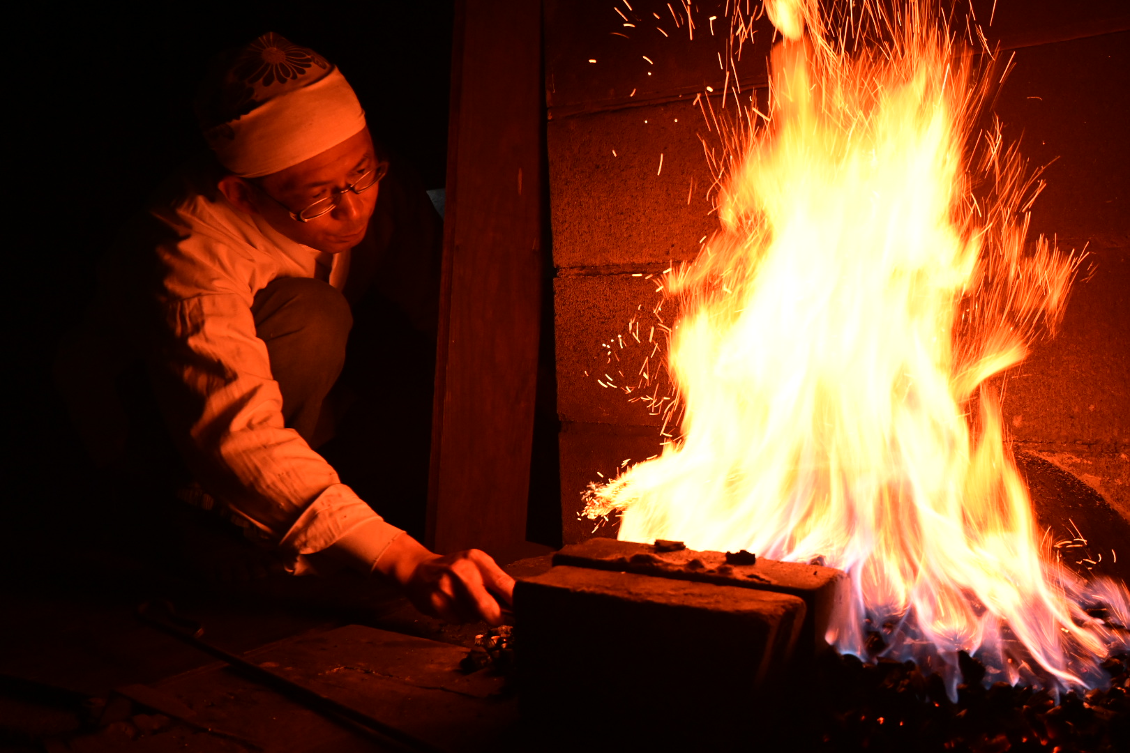 刀鍛冶にしか扱うことを許されない「玉鋼」。日本刀と同じ製法、上質の材料を使った刀鍛冶体験です。人間国宝の技を受け継ぐ田中刀匠の直接指導で、全長約18cm~19.5cmの小刀をつくります。