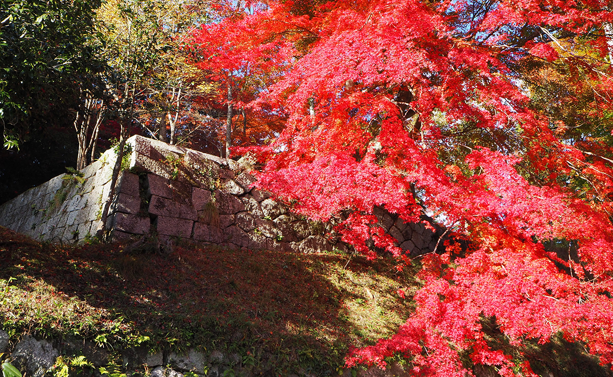 室町時代後期、三雲典膳が築城したと伝えられる典型的な山城跡で、今も枡形の虎口の遺構がしっかりした形で残っています。城内の一角には八丈岩があり、眼下に野洲川と対岸の竜王方面の眺望、また秋には紅葉が楽しめます。