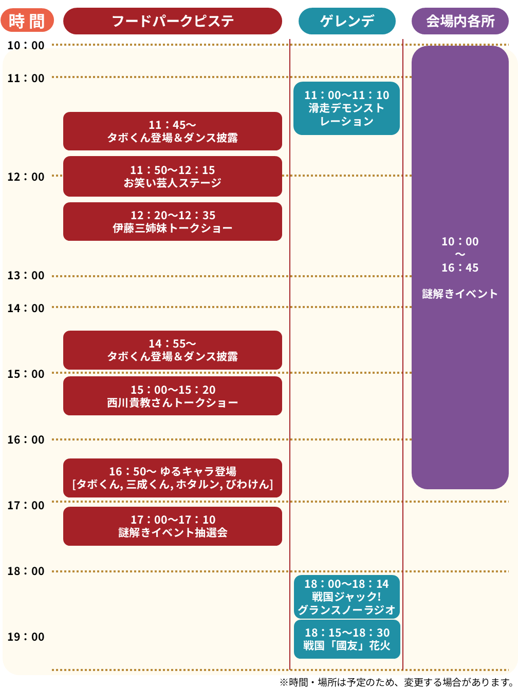 ※開催時間はあくまでも予定です。変更があれば、当サイトの「お知らせ」にてご案内いたします。
